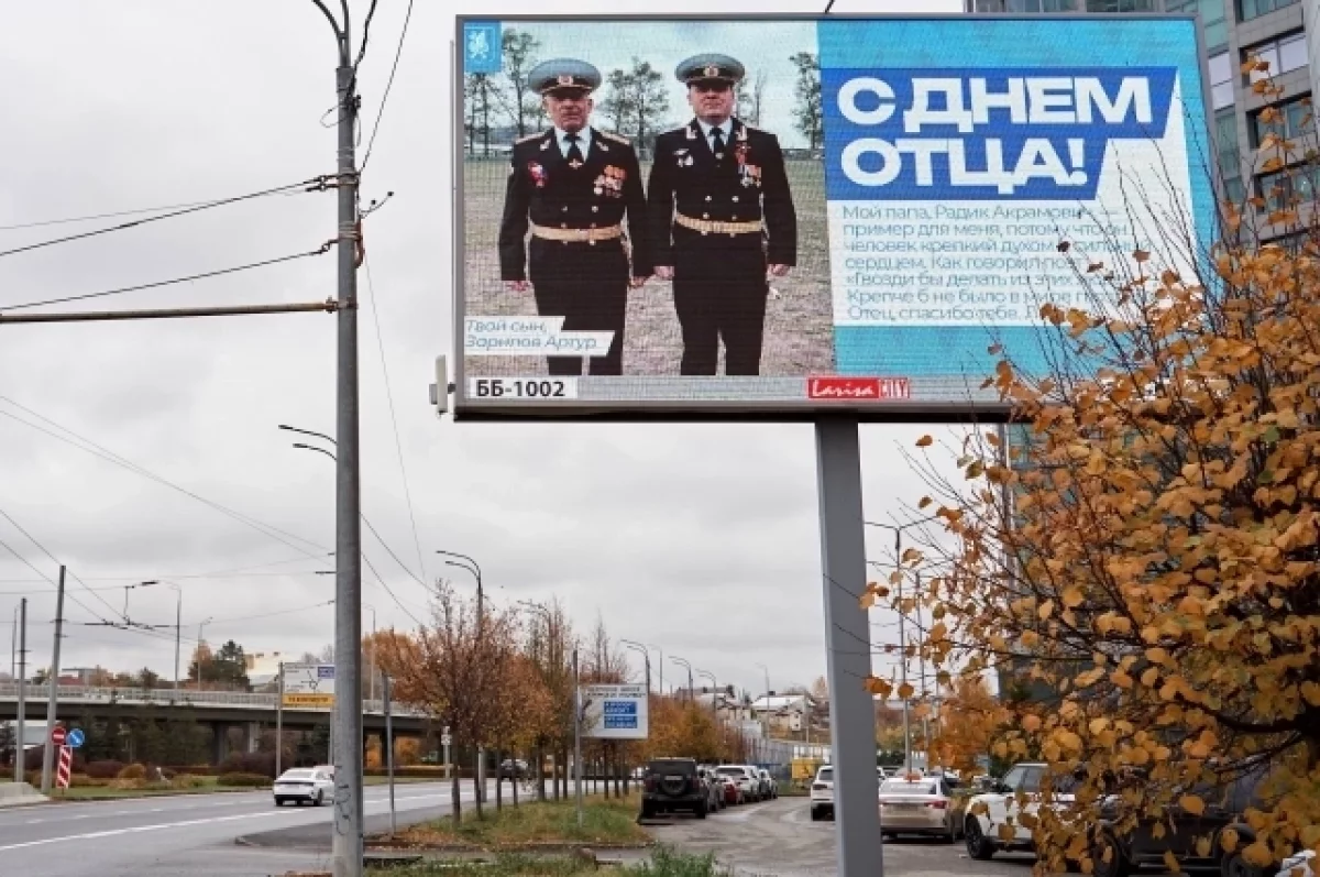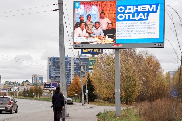В Казани к Дню отца появились баннеры с фотографиями отцов и теплыми словами, подчеркивающими их роль как опоры и примера для подражания.