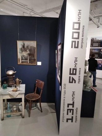 Центр зала занимает инсталляция из фотодокументов. Это лица солдат Красной армии, тружеников тыла, матерей, детей. Кто-то серьёзен, задумчив, кто-то улыбается.